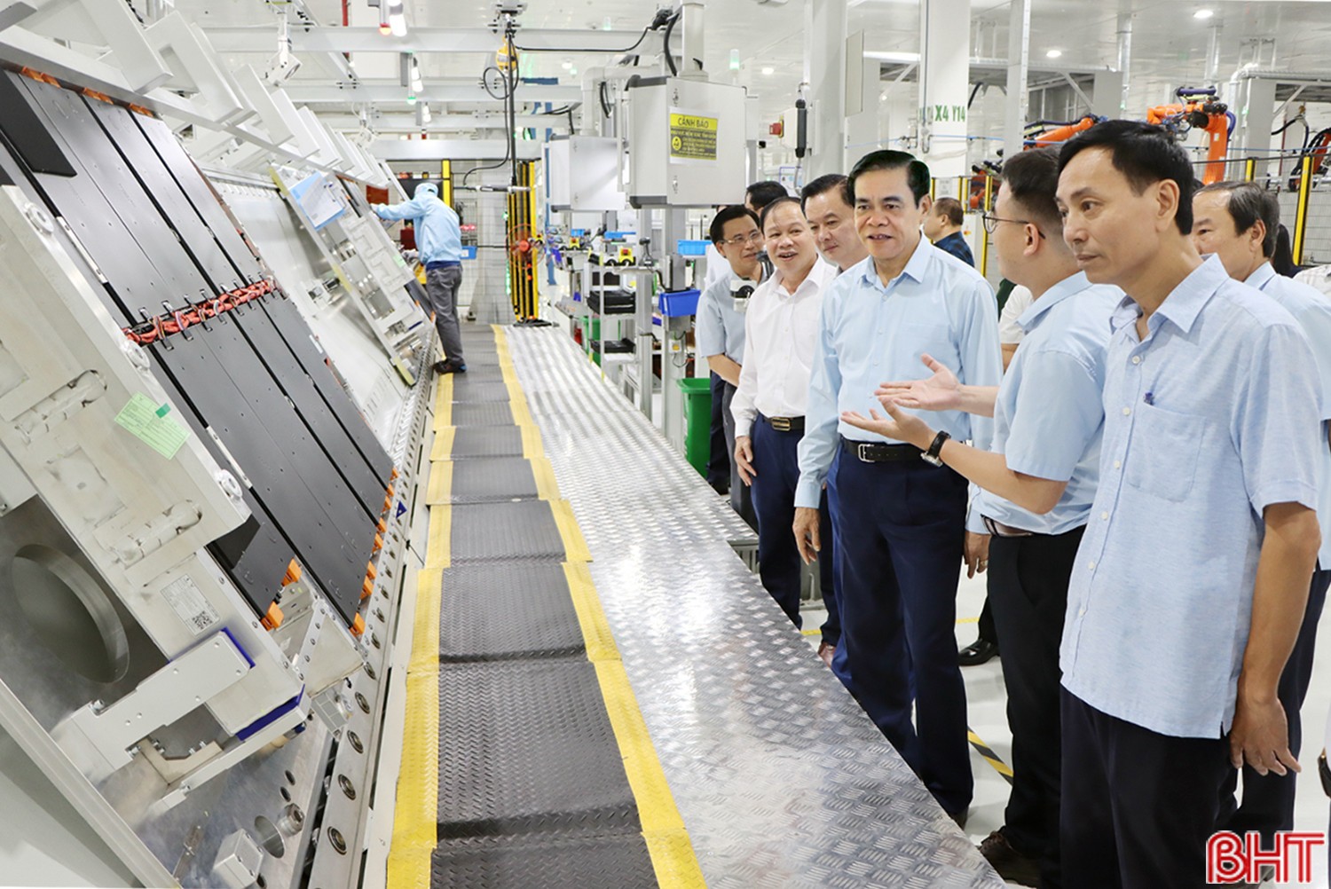 Chủ tịch UBND tỉnh Võ Trọng Hải cùng đoàn công tác nắm bắt tình hình sản xuất tại Nhà máy sản xuất Pin VinES (tháng 5/2024).