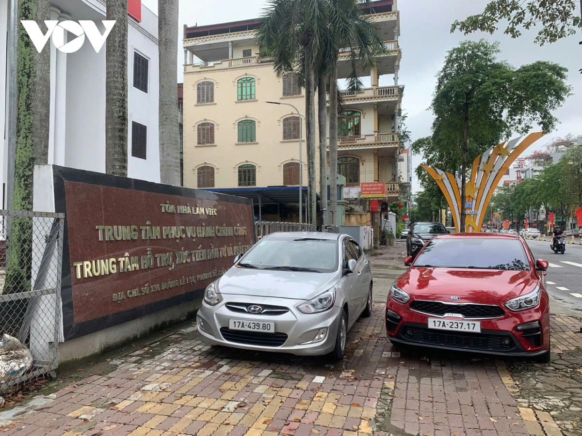 Một trụ sở ở tỉnh Thái Bình (cũ) không có người làm việc, người dân tranh thủ đỗ xe. Ảnh: PV