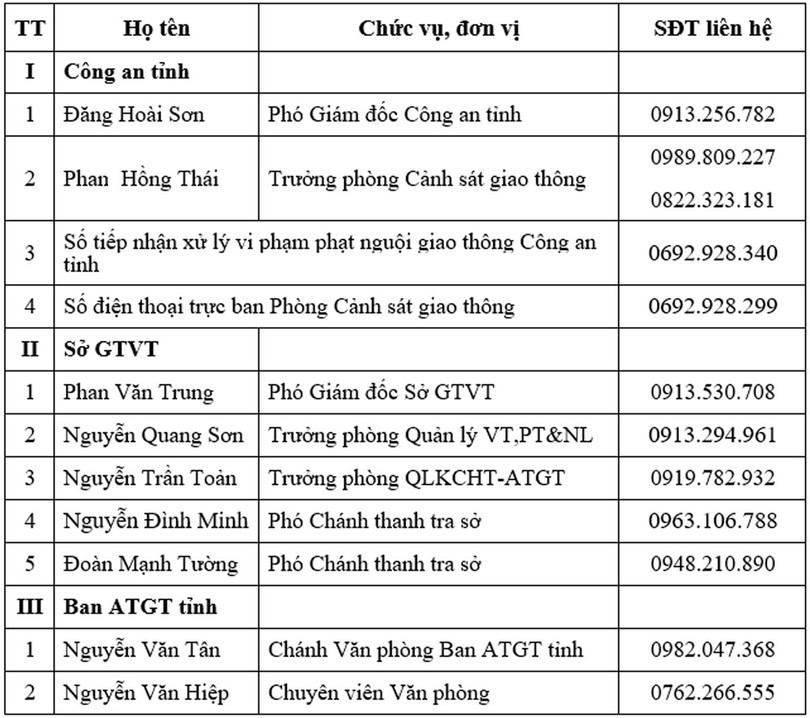 Thực hiện Công điện số 26/CĐ-UBND ngày 18/12/2024 của UBND tỉnh về việc nâng cao hiệu quả công tác bảo đảm, trật tự an toàn giao thông trên địa bàn tỉnh, Ban ATGT tỉnh tổng hợp, công bố danh sách số điện thoại đường dây nóng trong thời gian nghỉ lễ Tết Dương lịch, Tết Nguyên đán Ất Tỵ, Lễ hội xuân năm 2025 và thời gian tiếp theo, như sau: