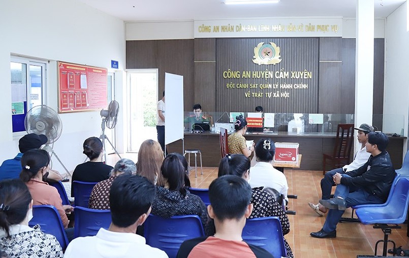 Người dân có mặt tại Đội Cảnh sát QLHC về TTXH (Công an huyện Cẩm Xuyên) để làm thủ tục liên quan đến thẻ căn cước.