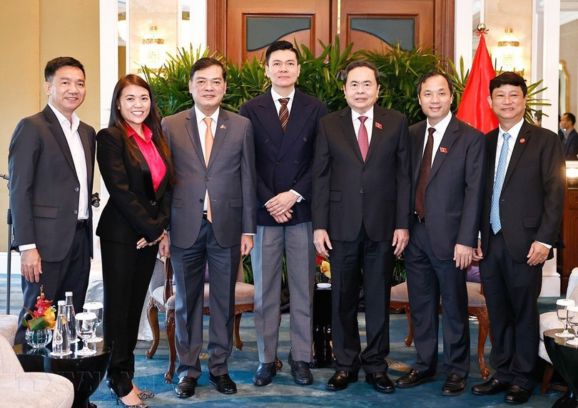Chủ tịch Quốc hội Trần Thanh Mẫn, Bí thư Tỉnh ủy Hoàng Trung Dũng cùng đại biểu chụp hình lưu niệm với lãnh đạo Tập đoàn Sembcorp. Ảnh: TTXVN