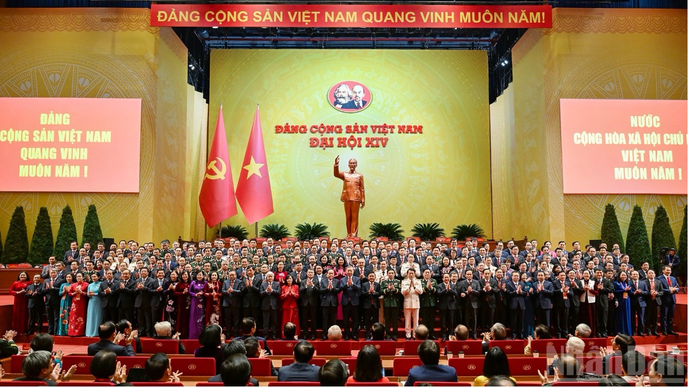 Ban Chấp hành Trung ương Đảng Cộng sản Việt Nam khoá XIV ra mắt Đại hội. (Ảnh DUY LINH)