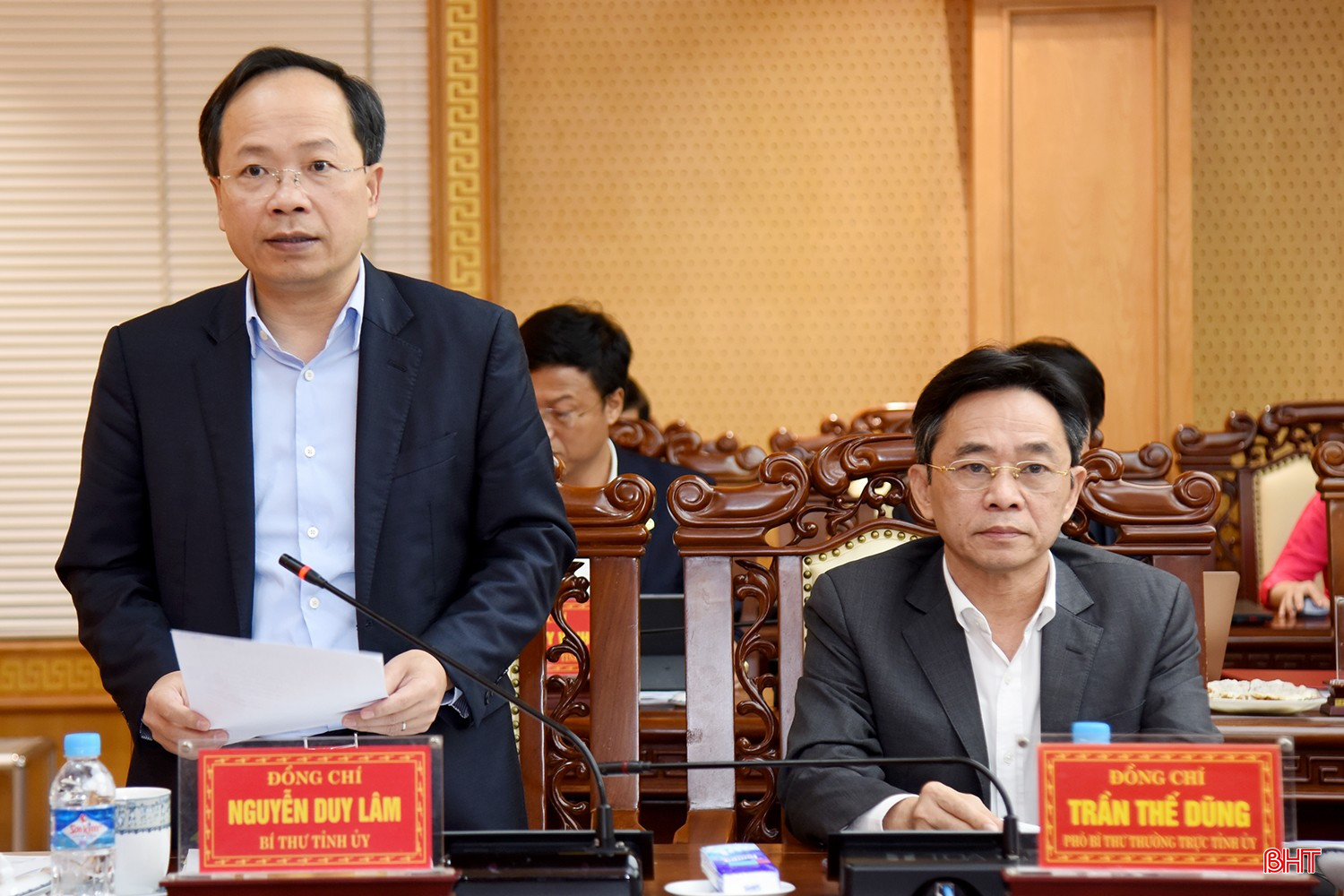 Phát biểu tại buổi làm việc, thay mặt Ban Thường vụ Tỉnh ủy, Bí thư Tỉnh ủy Nguyễn Duy Lâm cảm ơn đoàn kiểm tra đã ghi nhận những kết quả mà tỉnh Hà Tĩnh đã đạt được; đồng thời chỉ ra những tồn tại, hạn chế, khó khăn, vướng mắc trong quá trình lãnh đạo, chỉ đạo và tổ chức thực hiện các nghị quyết, chỉ thị, kết luận của Trung ương; tổng hợp các kiến nghị, đề xuất của tỉnh gửi tới Trung ương.