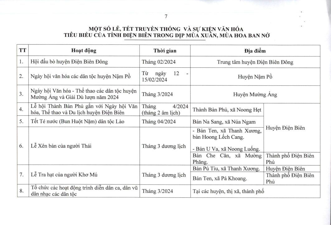 Lễ khai mạc Năm du lịch quốc gia Điện Biên và Lễ hội Hoa Ban năm 2024 sẽ diễn ra từ tháng 1/2024 đến tháng 5/2024. Các hoạt động chính trong khuôn khổ lễ hội từ ngày 13 - 18/3/2024 tại thành phố Điện Biên Phủ, gồm: Lễ dâng hương tại Đền thờ Liệt sĩ tại Chiến trường Điện Biên Phủ; Lễ khai mạc Năm du lịch quốc gia Điện Biên 2024 với chủ đề “Về miền Hoa Ban” với chương trình nghệ thuật đặc sắc và màn bắn pháo hoa nổ rực rỡ dự kiến diễn ra vào 19 giờ 30 phút ngày 16/3 tại Quảng Trường 7-5 thành phố Điện Biên Phủ.
