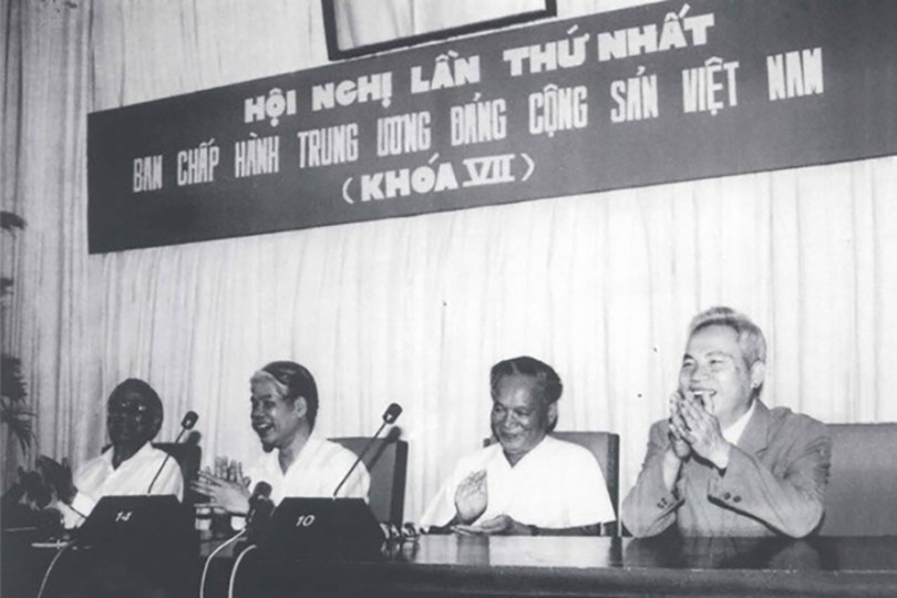 Tổng Bí thư Đỗ Mười và đồng chí Đào Duy Tùng (ngoài cùng bên phải) cùng các đồng chí trong Ban Chấp hành Trung ương Đảng Cộng sản Việt Nam khóa VII. Ảnh tư liệu.
