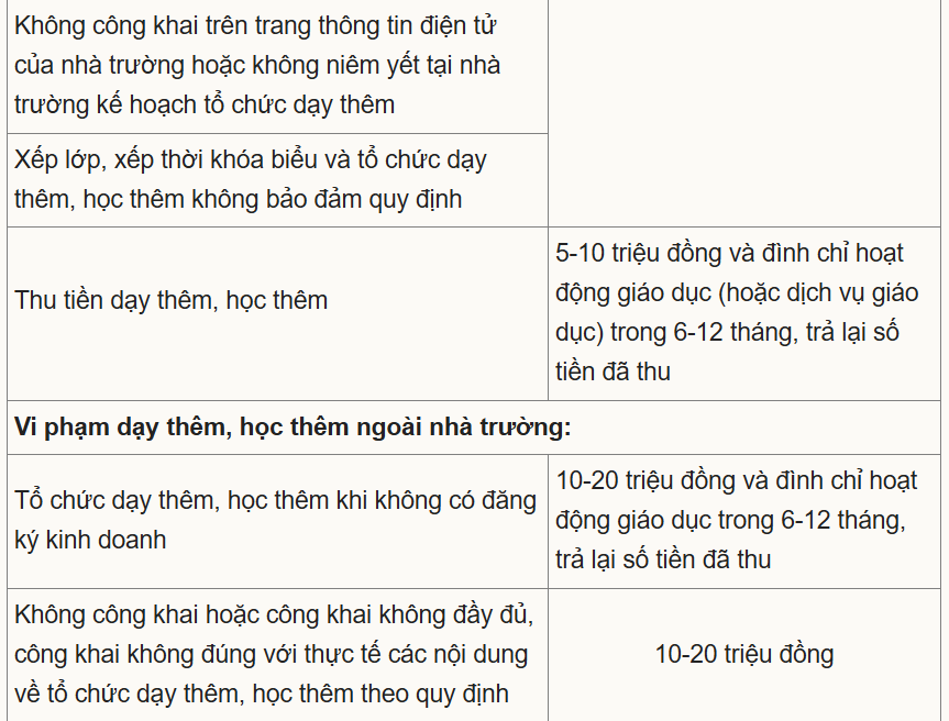 Nhà trường sẽ bị phạt 5-10 triệu đồng nếu tổ chức dạy thêm cho học sinh không thuộc diện quy định; khi không có đơn đăng ký của người học theo từng môn; không xây dựng kế hoạch dạy thêm ở từng môn, khối lớp và không công khai. Nếu thu tiền dạy thêm của học sinh, trường bị phạt 10-20 triệu đồng...