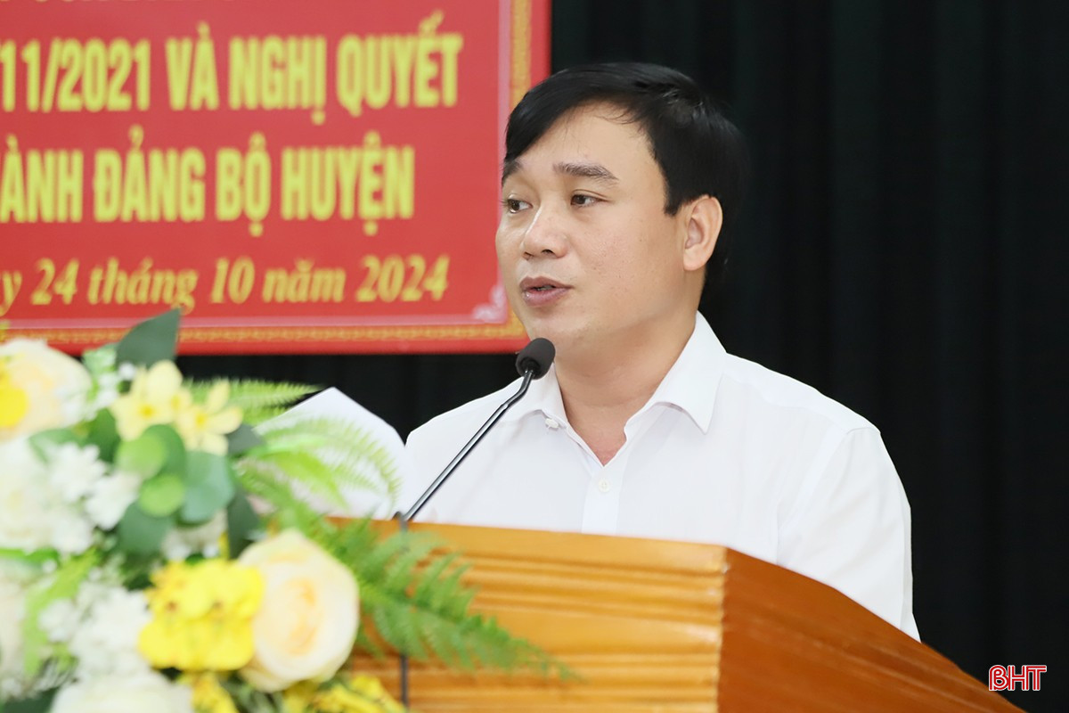 Ông Hoàng Xuân Hùng - Phó Chủ tịch UBND huyện Đức Thọ báo cáo kết quả 3 năm thực hiện Nghị quyết số 05-NQ/TU ngày 22/10/2021 và Nghị quyết số 05-NQ/HU ngày 19/11/2021.