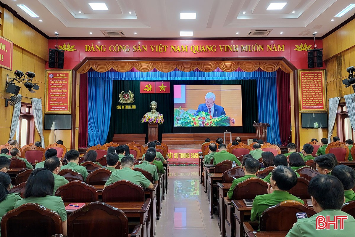 Điểm cầu Công an tỉnh theo dõi phóng sự tại hội nghị.