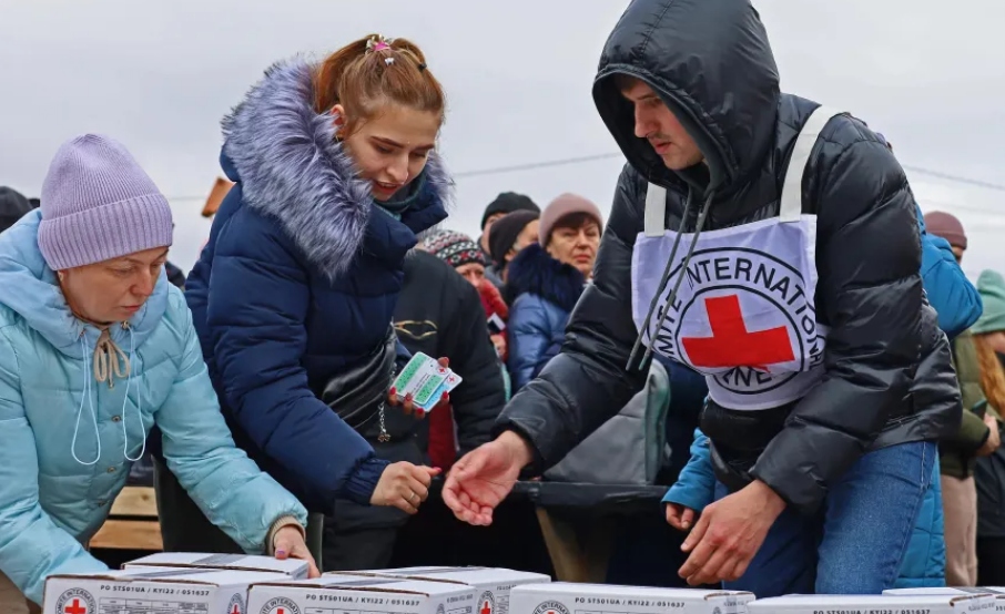 Người dân Ukraine nhận hàng cứu trợ và thiết bị y tế. (Ảnh: AP)
