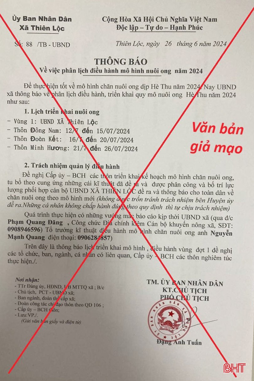 Vào 15h ngày 11/7, anh Lê Anh Tuấn (trú tại xã Phú Lộc, Can Lộc) là hộ kinh doanh vật tư nuôi ong nhận được cuộc gọi và tin nhắn của người mạo danh là cán bộ UBND xã Thiên Lộc cùng văn bản của UBND xã Thiên Lộc liên hệ đặt mua số lượng lớn mặt hàng kinh doanh của anh Tuấn kèm theo loại thuốc diệt côn trùng.