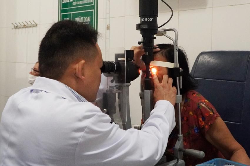 Bác sỹ Bệnh viện Mắt Hà Tĩnh thăm khám cho một bệnh nhân bị đau mắt đỏ.