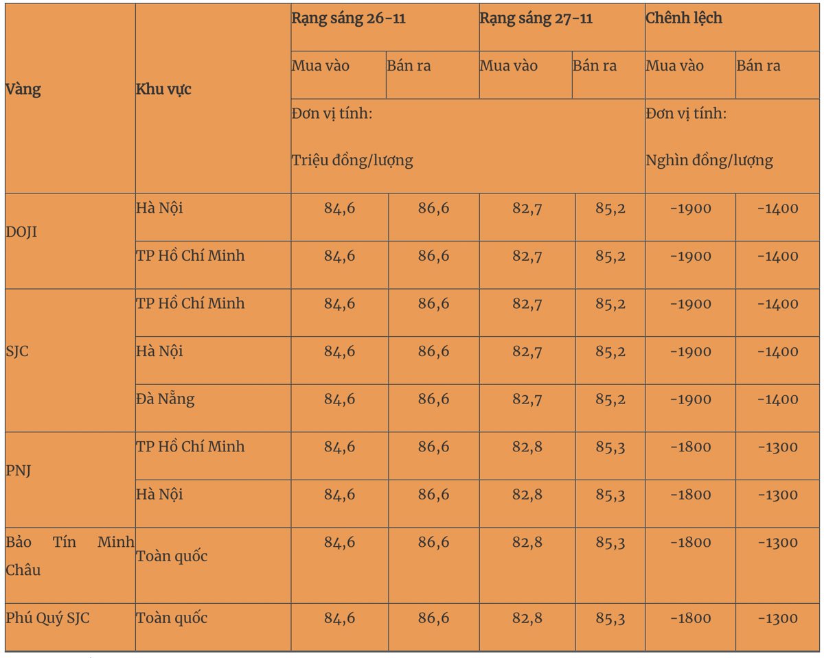 Giá vàng miếng trong nước cập nhật lúc 5 giờ 30 phút sáng 27-11 như sau: