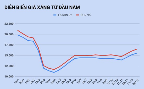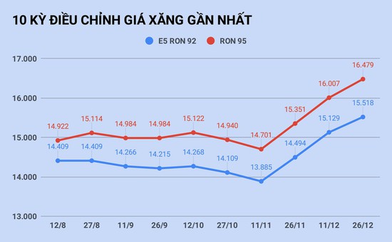 Chiều 26/12, liên Bộ Tài chính - Công Thương quyết định điều chỉnh giá bán lẻ xăng dầu theo chu kỳ 15 ngày/lần. Theo đó, giá xăng RON 95 được điều chỉnh tăng 472 đồng/lít, xăng E5 RON 92 tăng 389 đồng/lít. Mức giá bán lẻ tối đa với xăng E5 RON 92 là 15.518 đồng/lít và xăng RON 95 là 16.479 đồng/lít.