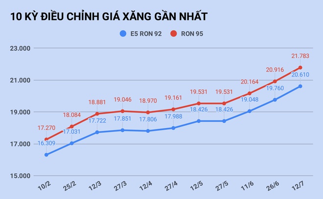 Chiều 12/7, liên Bộ Tài chính - Công Thương quyết định điều chỉnh giá bán lẻ xăng dầu theo chu kỳ 15 ngày/lần. Theo đó, giá xăng RON 95 được điều chỉnh tăng 867 đồng/lít, xăng E5 RON 92 tăng 850 đồng/lít. Mức giá bán lẻ tối đa với xăng E5 RON 92 là 20.610 đồng/lít và xăng RON 95 là 21.783 đồng/lít.