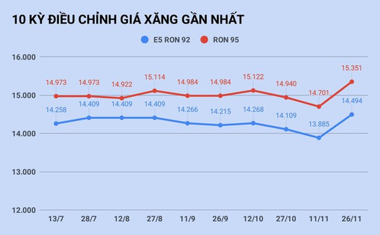 Trao đổi với Zing , lãnh đạo một doanh nghiệp đầu mối ở TP.HCM cho biết giá xăng thế giới những ngày qua tăng tương đối nhanh. Nếu không tác động đến quỹ bình ổn, ở kỳ điều hành ngày 11/12, giá xăng E5 RON 92 có thể tăng 510 đồng/lít, giá xăng RON 95 tăng 630 đồng/lít.