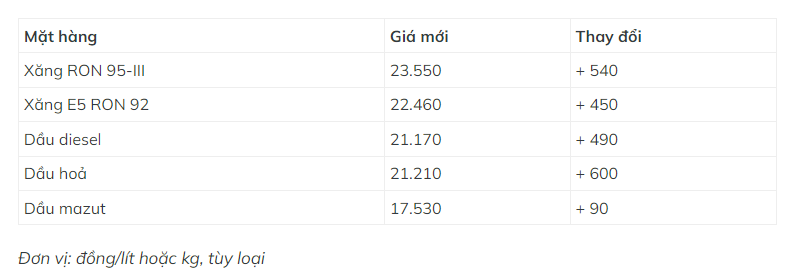 Giá xăng RON 95-III (loại phổ biến trên thị trường) tăng 540 đồng, lên 23.550 đồng một lít. Còn E5 RON 92 ở mức 22.460 đồng một lít, tức thêm 450 đồng. Các mặt hàng
