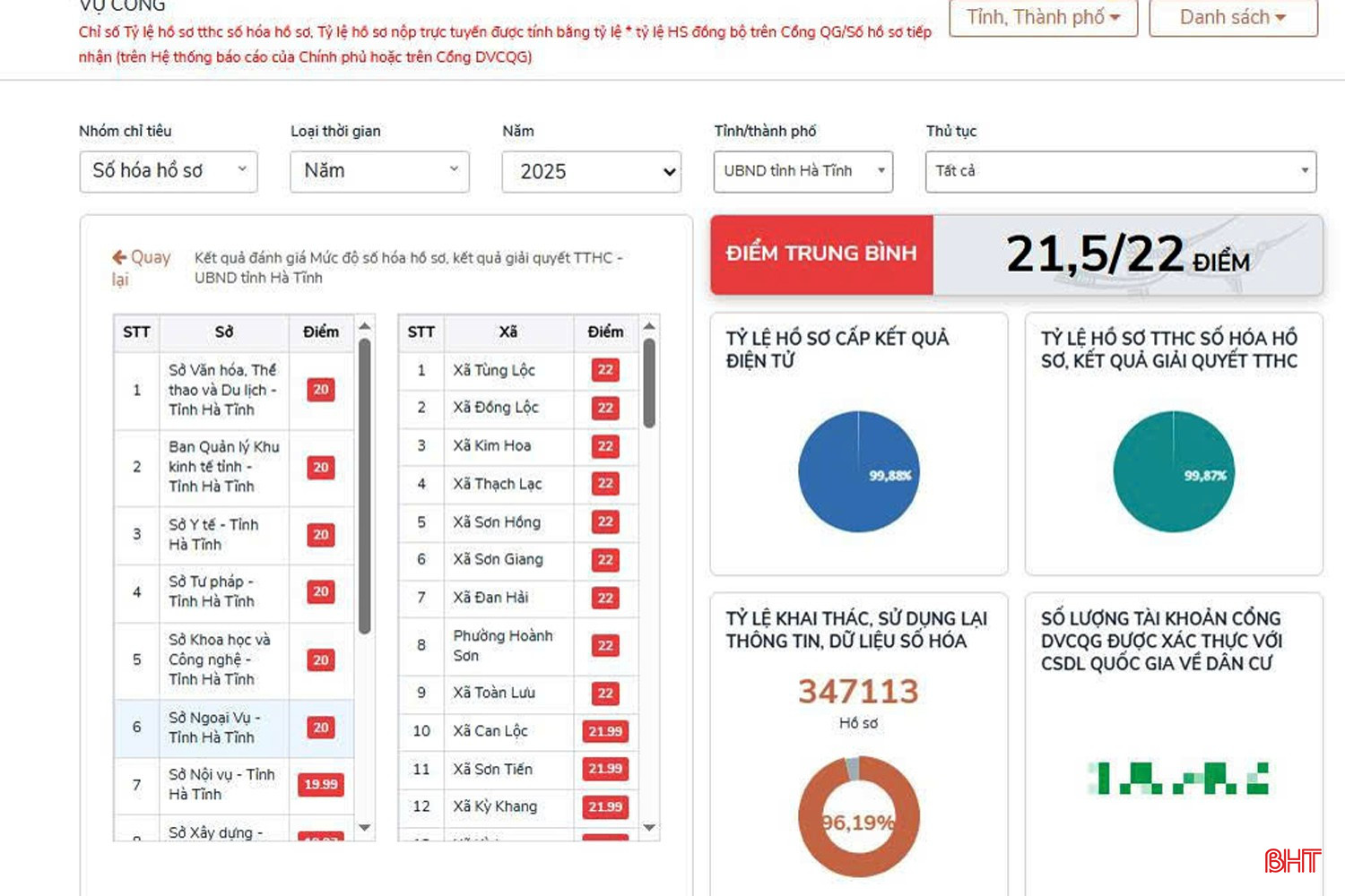 Tổng hợp từ Cổng Dịch vụ công Quốc gia, năm 2025, Hà Tĩnh đạt 21,5/22 điểm về kết quả số hóa hồ sơ trong giải quyết thủ tục hành chính (TTHC), xếp thứ nhất trong 34 tỉnh, thành phố.