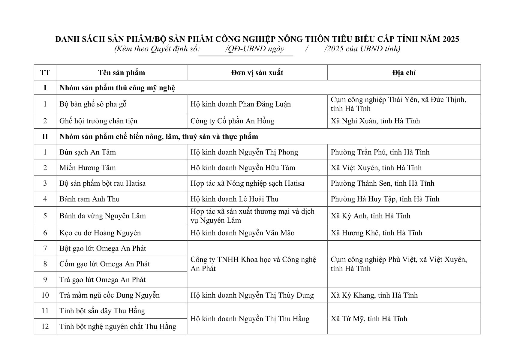 Danh sách 39 sản phẩm được công nhận sản phẩm công nghiệp nông thôn tiêu biểu cấp tỉnh năm 2025