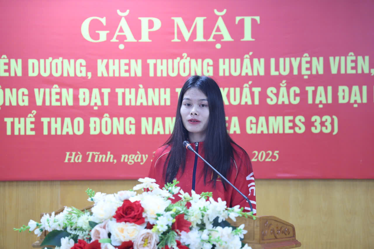 Phát biểu tại buổi lễ, đồng chí Nguyễn Thị Nguyệt – Phó Chủ tịch UBND tỉnh ghi nhận và biểu dương những thành tích xuất sắc của thể thao Hà Tĩnh tại SEA Games 33, khẳng định đây là kết quả của quá trình rèn luyện gian khổ, tinh thần vượt khó, ý chí cống hiến vì màu cờ sắc áo của các VĐV, HLV. Đồng chí nhấn mạnh, mặc dù điều kiện cơ sở vật chất, sân bãi, chế độ sinh hoạt còn nhiều khó khăn song bằng sự nỗ lực không ngừng, thể thao Hà Tĩnh đã đạt được những kết quả rất đáng tự hào, xếp trong nhóm dẫn đầu khu vực Bắc Trung Bộ và vượt lên nhiều địa phương trong cả nước.