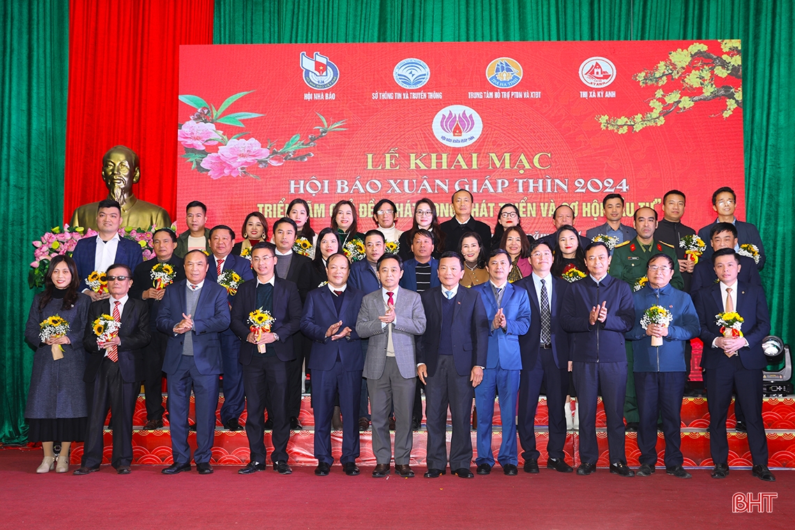 Phó Bí thư Thường trực Tỉnh ủy Trần Thế Dũng, Trưởng ban Tổ chức Tỉnh ủy Võ Hồng Hải, Phó Chủ tịch HĐND tỉnh Trần Văn Kỳ, Phó Chủ tịch UBND tỉnh Lê Ngọc Châu cùng lãnh đạo Hội Nhà báo tỉnh, lãnh đạo thị xã Kỳ Anh thực hiện nghi thức nhấn nút khai mạc Hội báo Xuân Giáp Thìn 2024 và triễn lãm “Khát vọng phát triển và cơ hội đầu tư”.