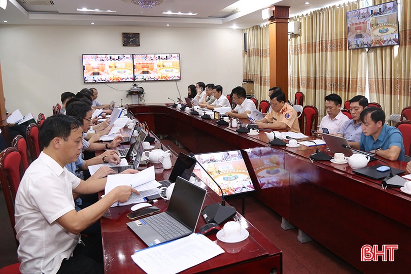 Phó Chủ tịch UBND tỉnh Trần Báu Hà và lãnh đạo Sở GTVT, Công an tỉnh điều hành điểm cầu Hà Tĩnh.