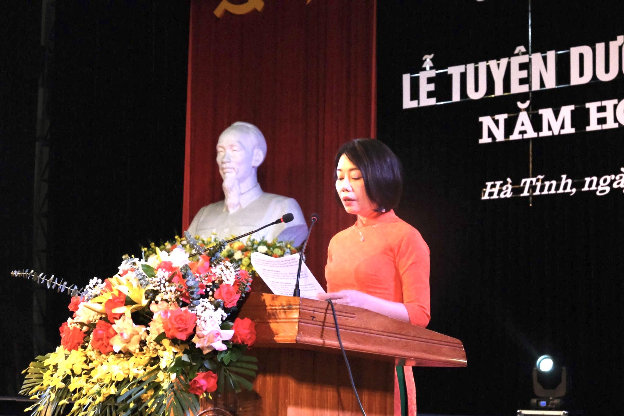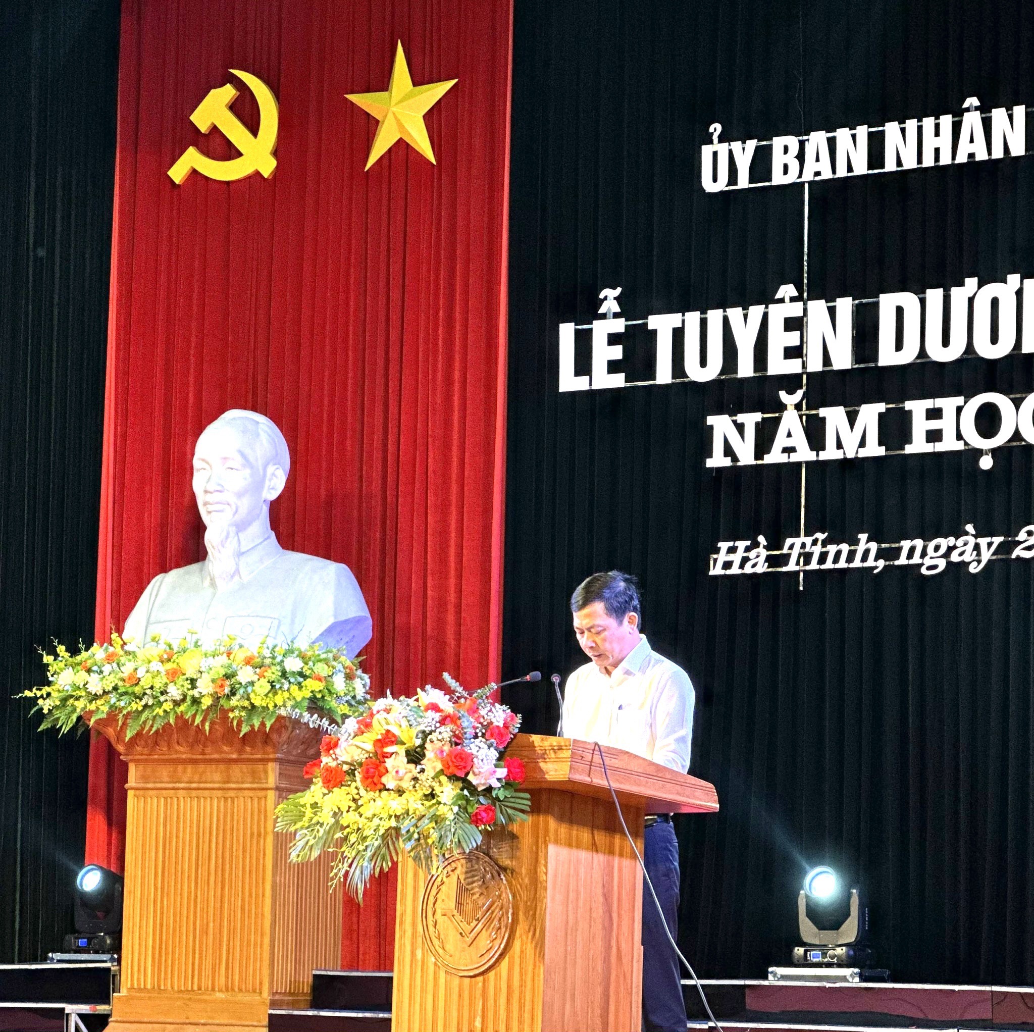 Phát biểu tại buổi lễ, Phó Chủ tịch UBND tỉnh Lê Ngọc Châu biểu dương những thành tích xuất sắc mà các em học sinh, các thầy cô giáo, cán bộ quản lý giáo dục, các nhà trường đã đạt được trong năm học 2023-2024. Phó Chủ tịch UBND tỉnh đề nghị toàn ngành tiếp tục quán triệt sâu sắc quan điểm của Đảng, Nhà nước về phát triển giáo dục - đào tạo; phát huy truyền thống và kết quả giáo dục của Hà Tĩnh. Quan tâm xây dựng đội ngũ nhà giáo tâm huyết, trách nhiệm, đạo đức tốt, chuyên môn, nghiệp vụ giỏi, hết lòng vì học sinh thân yêu. Tăng cường kỷ cương, nền nếp và nâng cao chất lượng giáo dục trong các cơ sở giáo dục, đào tạo. Đẩy mạnh công tác xã hội hóa giáo dục, kết hợp chặt chẽ giữa giáo dục nhà trường với giáo dục gia đình và giáo dục xã hội. Tiếp tục làm tốt công tác phát hiện, bồi dưỡng học sinh giỏi.