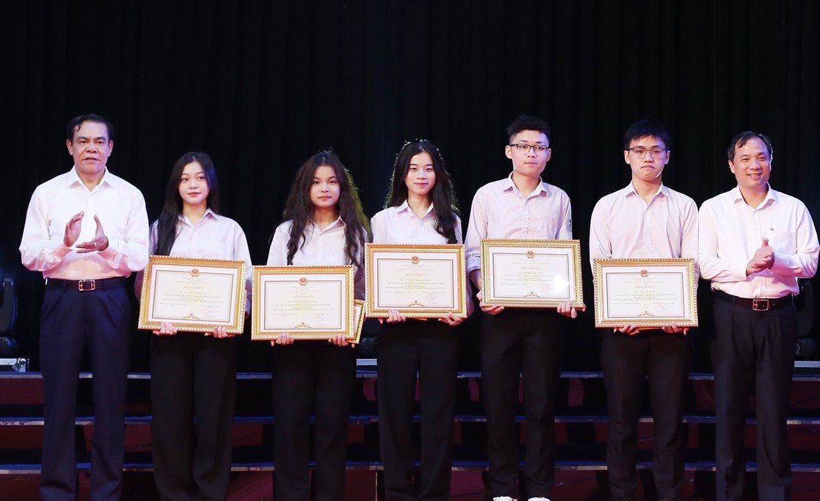 Lãnh đạo Sở GD&ĐT, Hội Khuyến học tỉnh trao bằng khen của Bộ GD&ĐT cho các học sinh đạt giải khuyến khích quốc gia.
