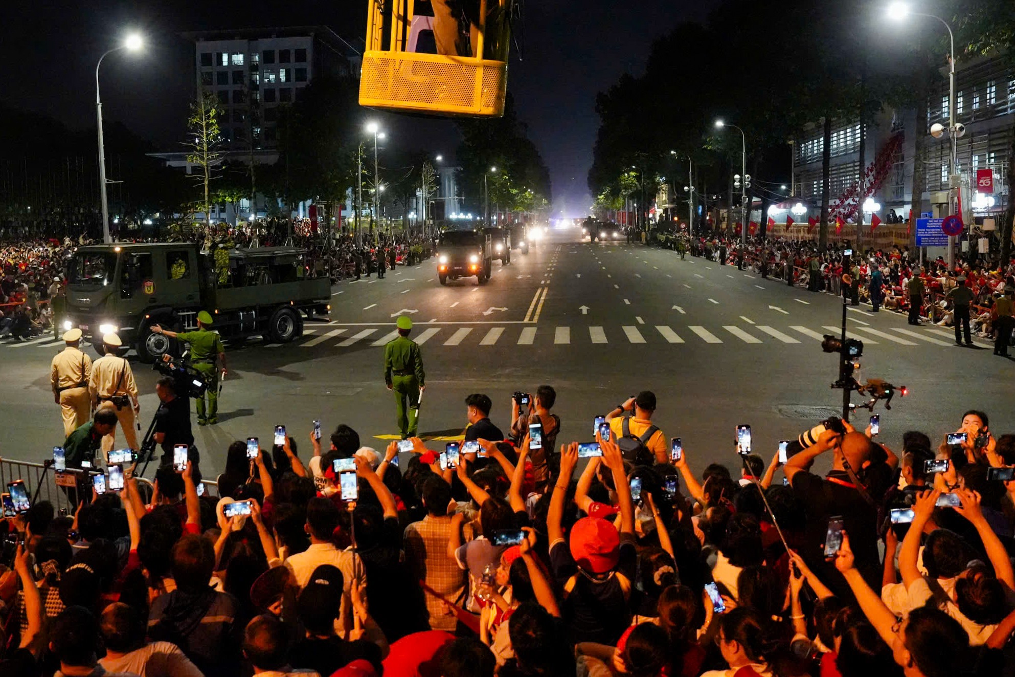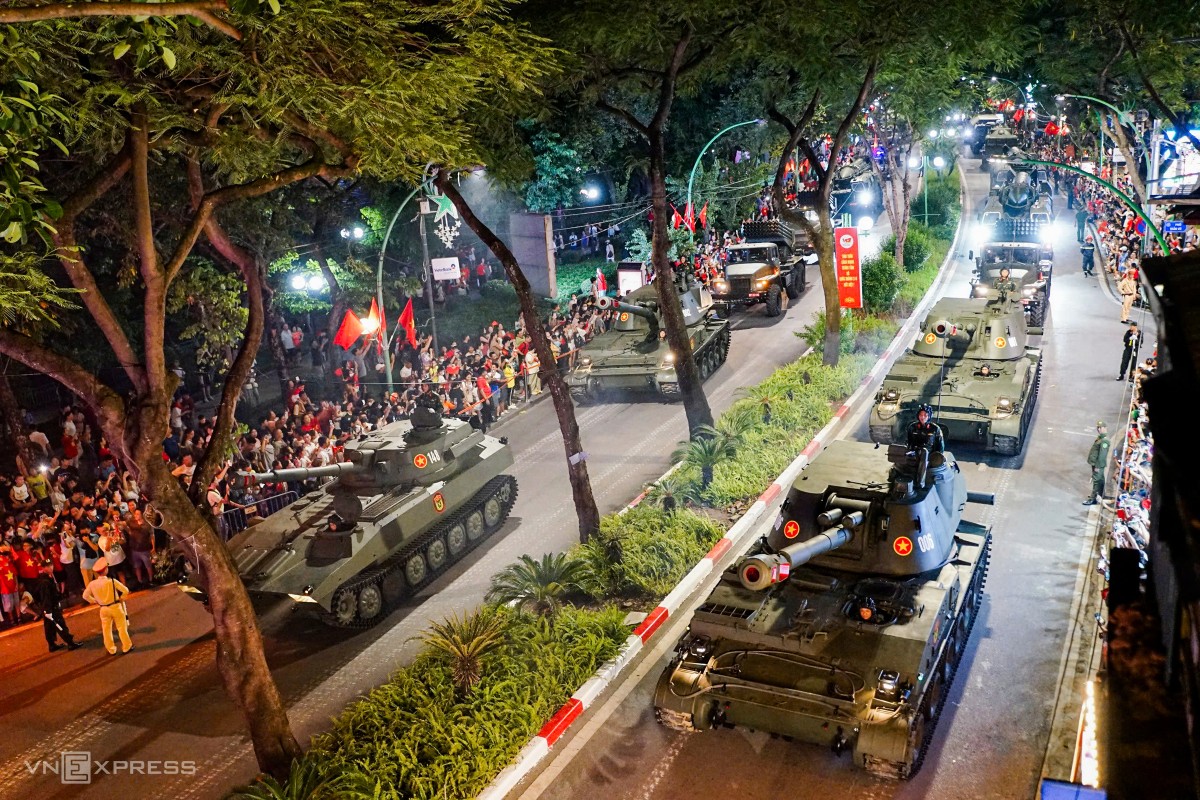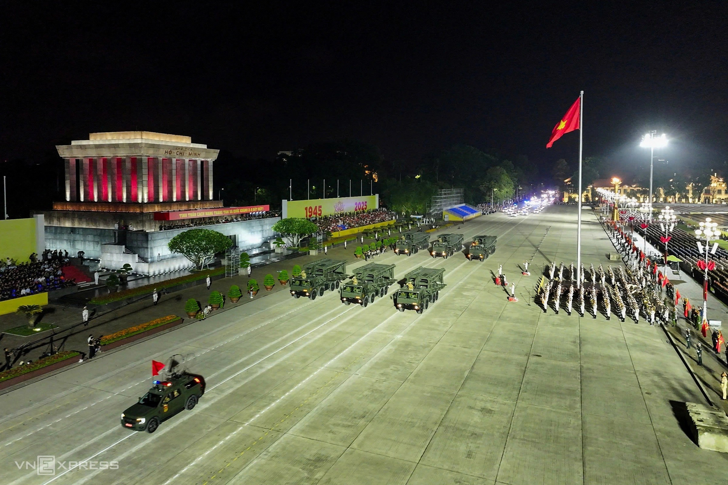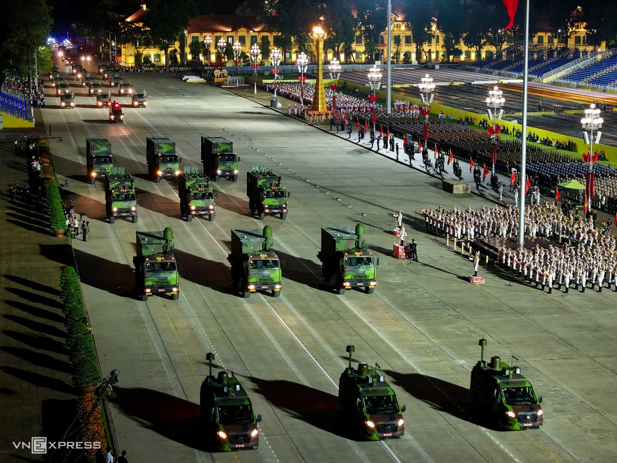 Buổi hợp luyện bắt đầu lúc 20h với hơn 16.300 quân nhân từ 43 khối đứng, 18 khối đi, 6 khối xe pháo quân sự của Quân đội, 8 khối xe đặc chủng Công an cùng lực lượng quân đội Nga, Lào, Campuchia. Dự buổi hợp luyện có Đại tướng Phan Văn Giang, Bộ trưởng Quốc phòng; Đại tướng Nguyễn Tân Cương, Tổng tham mưu trưởng QĐND Việt Nam; cùng lãnh đạo Bộ Quốc phòng, Bộ Công an, Ban Tuyên giáo và Ban Dân vận Trung ương. Trong ảnh là dàn xe chở khí tài quân sự diễu hành qua lễ đài. Ảnh: Tuấn Huy