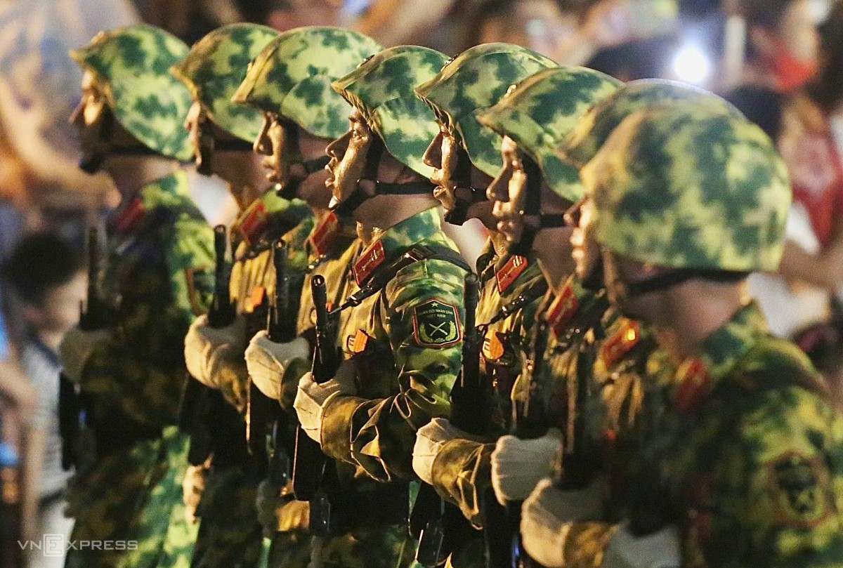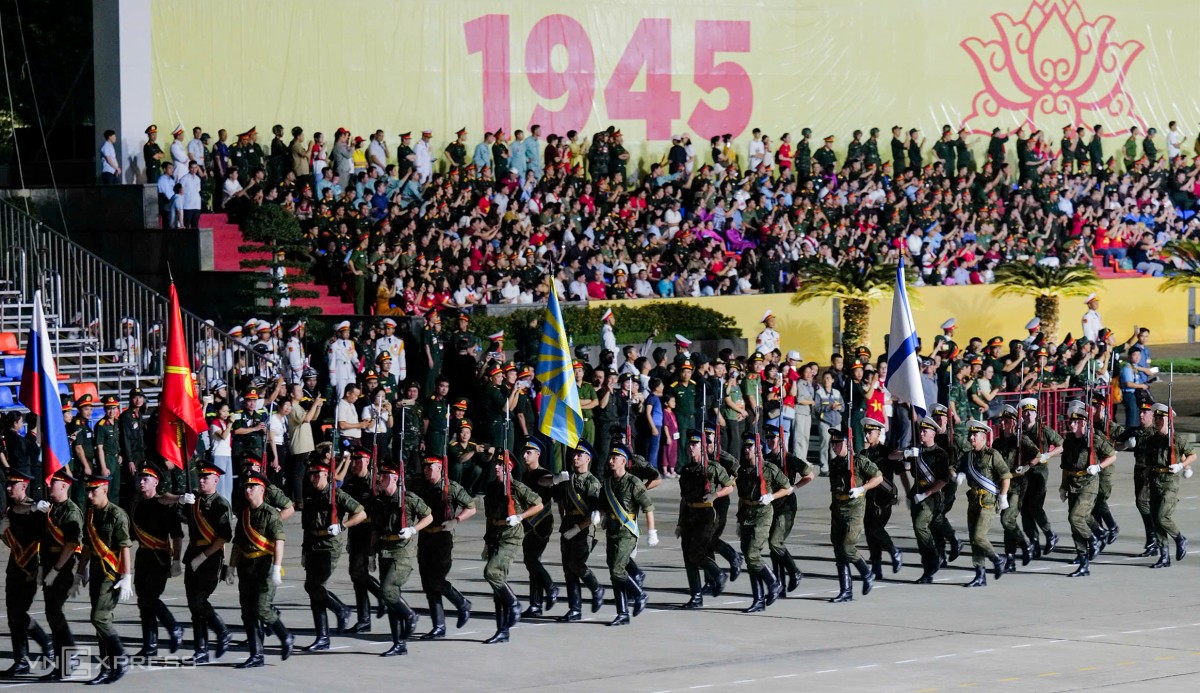 Lần đầu tiên, hơn 30 quân nhân Nga bồng súng, diễu hành tại quảng trường Ba Đình. Họ đến Nội Bài trưa 20/8, tham gia lễ diễu binh diễu hành kỷ niệm 80 năm Quốc khánh Việt Nam (A80), theo lời mời của Bộ Quốc phòng. Ảnh: Ngọc Thành