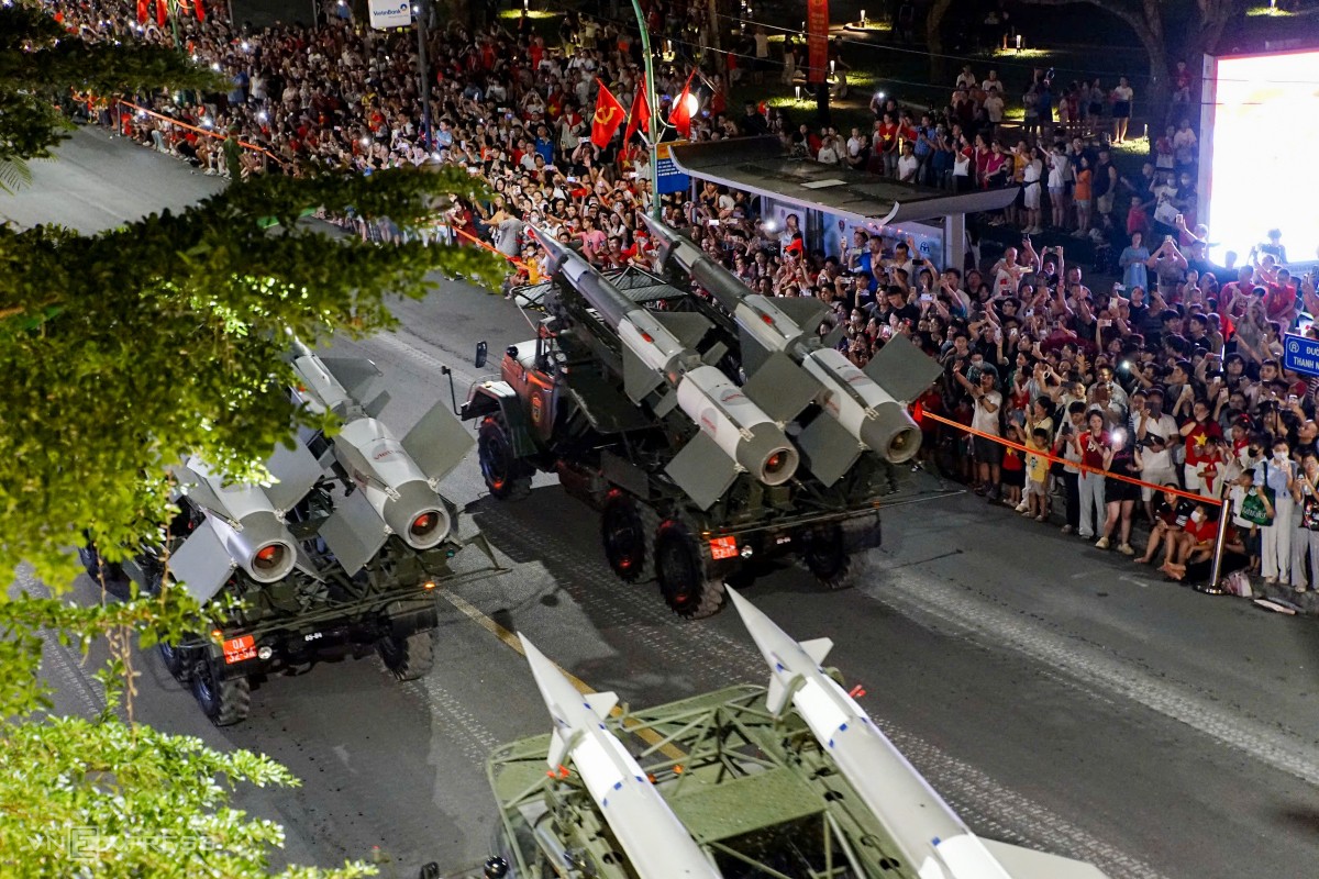 Trên đường Thanh Niên, nhiều loại tên lửa, vũ khí được tập kết diễu hành, hai bên đường ken đặc người dân theo dõi. Ảnh: Phạm Dự