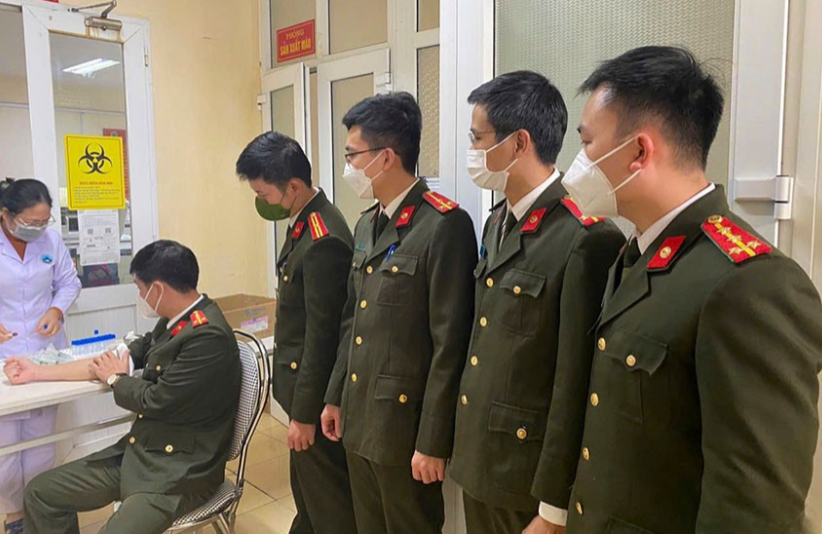 Các chiến sỹ Công an thành viên CLB Ngân hàng máu sống Công an Hà Tĩnh thực hiện các bước hiến máu cấp cứu tại Bệnh viện Đa khoa tỉnh.