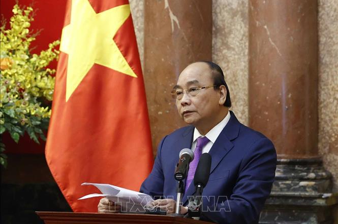 Chủ tịch nước Nguyễn Xuân Phúc phát biểu tại buổi gặp mặt. Ảnh: Thống Nhất/TTXVN