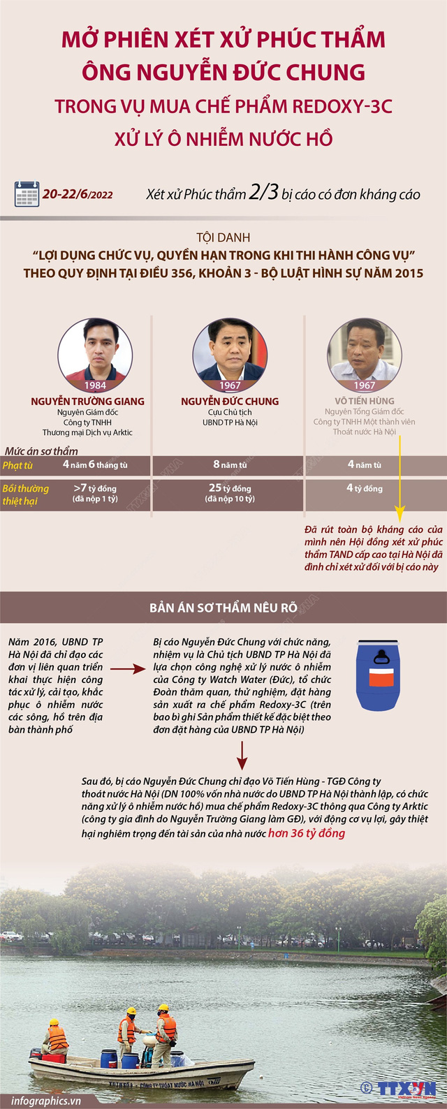 Theo bản án sơ thẩm, năm 2016, UBND thành phố Hà Nội đã chỉ đạo các đơn vị liên quan triển khai thực hiện công tác xử lý, cải tạo, khắc phục ô nhiễm nước các sông, hồ trên địa bàn thành phố bằng cách tìm kiếm các công nghệ tiên tiến phù hợp để xử lý ô nhiễm nước hồ trên địa bàn thành phố. Bị cáo Nguyễn Đức Chung với chức năng, nhiệm vụ là Chủ tịch UBND thành phố Hà Nội đã lựa chọn công nghệ xử lý nước ô nhiễm của Công ty Watch Water (Cộng hòa Liên bang Đức) tổ chức đoàn tham quan, thử nghiệm, đặt hàng sản xuất ra chế phẩm Redoxy-3C để sử dụng vào việc xử lý ô nhiễm nước tại thành phố. Sau đó, bị cáo Nguyễn Đức Chung chỉ đạo bị cáo Võ Tiến Hùng mua chế phẩm Redoxy-3C, thông qua Công ty Trách nhiệm hữu hạn Thương mại Dịch vụ Arktic (do Nguyễn Trường Giang làm Giám đốc) là công ty gia đình của bị cáo Nguyễn Đức Chung, với động cơ vụ lợi gây thiệt hại nghiêm trọng đến tài sản của Nhà nước, với tổng giá trị thiệt hại hơn 36 tỷ đồng.
