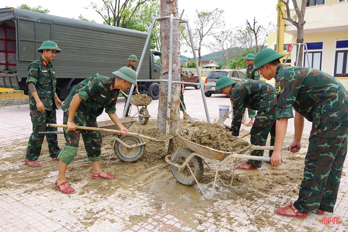 Ở hướng khác, gần 50 cán bộ, chiến sĩ Trung đoàn 841 và bộ đội biên phòng đang tích cực khắc phục tại Trường Mầm non Lộc Hà (xã Lộc Hà) như dọn dẹp vật dụng hư hỏng, cắt tỉa cây gãy đổ, sửa sang khu vui chơi. Hiệu trưởng Trần Thị Thủy xúc động: “Bão đã làm tốc mái toàn bộ dãy nhà cấp 4, nhiều đồ dùng học tập hư hỏng. Các chú bộ đội có mặt kịp thời giúp dọn dẹp, sửa chữa, tiếp thêm niềm tin để các cháu sớm trở lại trường”.