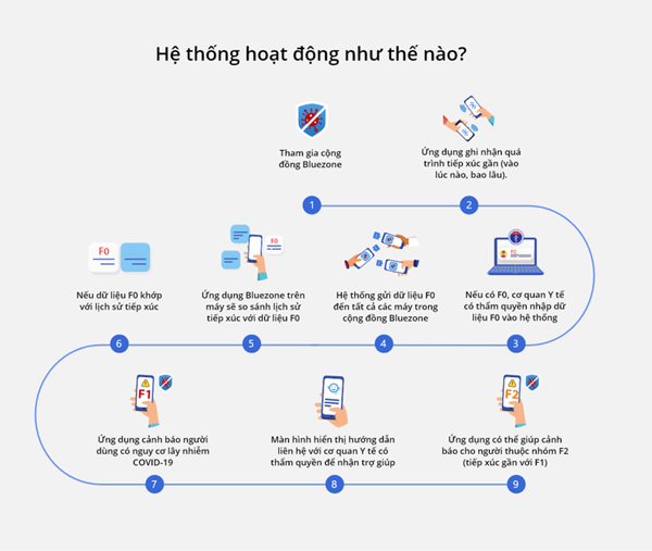 Ứng dụng Bluezone ghi nhận những người tiếp xúc gần trong khoảng 2m, nếu một người trong mạng lưới tiếp xúc gần bị phát hiện lây nhiễm thì phần mềm sẽ chỉ ra những người tiếp xúc gần còn lại, giúp cho việc truy vết, khoanh vùng dập dịch nhanh chóng.