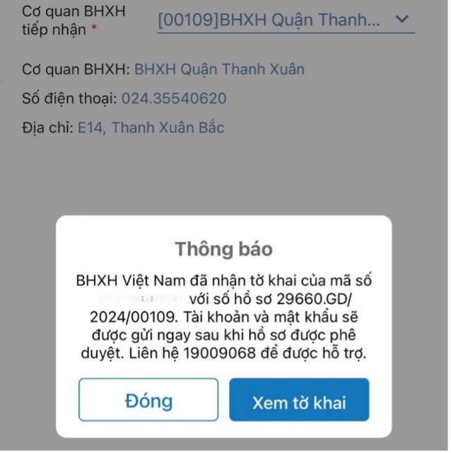 Nếu có thông báo "BHXH Việt Nam đã nhận tờ khai của mã số ….. với số hồ sơ ….." tức là hồ sơ đã được tiếp nhận. Sau đó người dân có thể liên hệ tới Cơ quan BHXH nơi đang tham gia hoặc nơi cư trú để được phê duyệt và cấp mật khẩu để sử dụng. Nếu có vướng mắc, người dân có thể gọi tới số tổng đài 1900.9068 để được giải đáp.