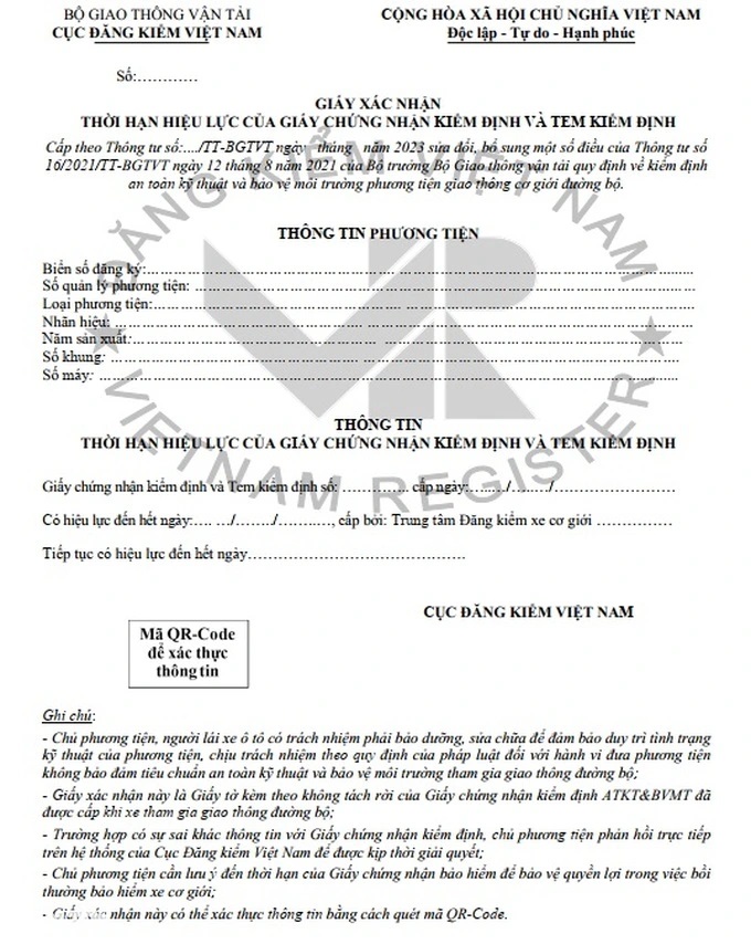 Thông tư cũng quy định mẫu Giấy xác nhận gia hạn hiệu lực của Giấy chứng nhận, Tem kiểm định của ô tô chở người đến 9 chỗ không kinh doanh vận tải.