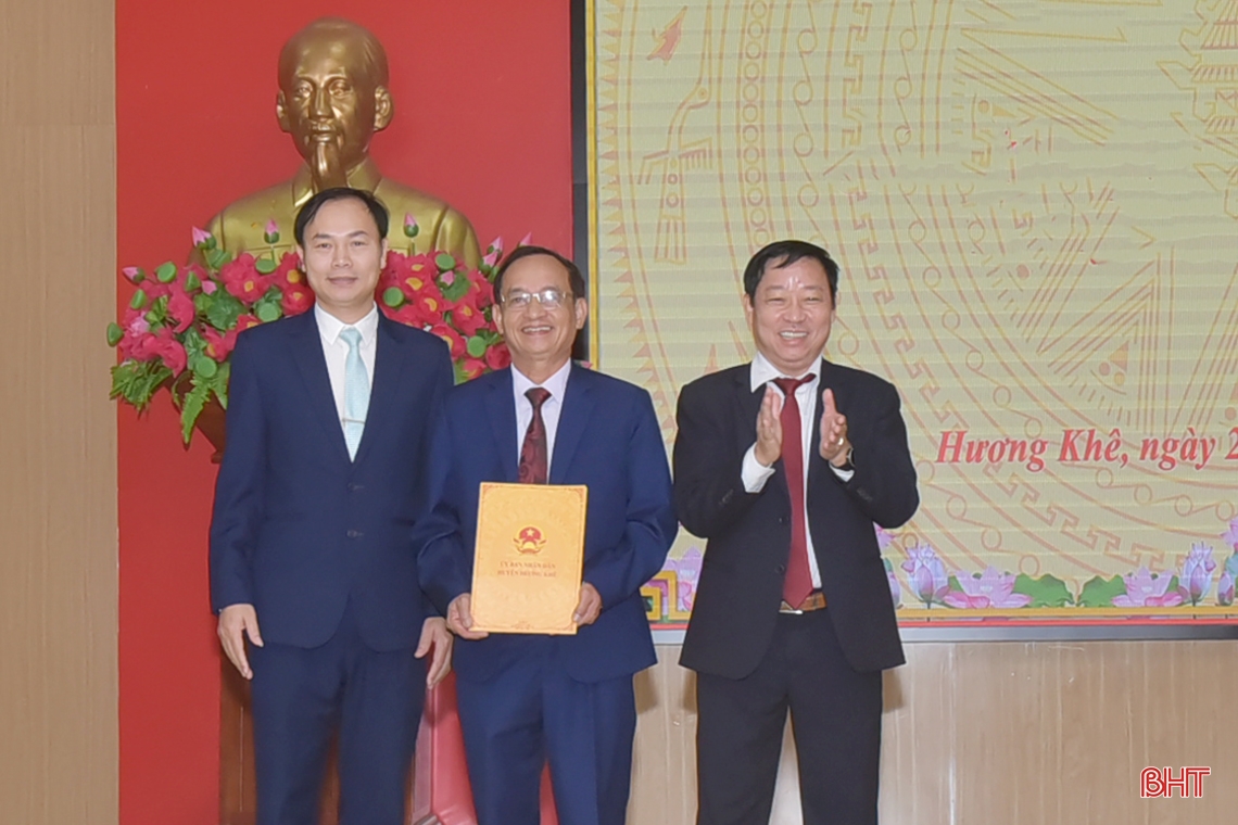 Lãnh đạo huyện Hương Khê trao quyết định thành lập Quỹ khuyến học, khuyến tài huyện cho các đồng chí ban quản lý Quỹ.