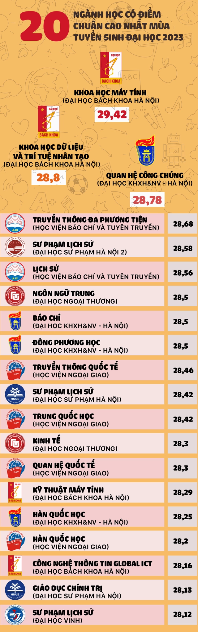 INFOGRAPHIC: 20 ngành học có điểm chuẩn cao nhất mùa tuyển sinh đại học 2023