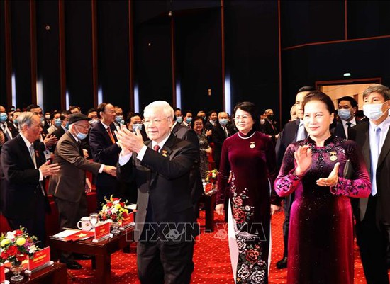 Tổng Bí thư, Chủ tịch nước Nguyễn Phú Trọng, Chủ tịch Quốc hội Nguyễn Thị Kim Ngân, Phó Chủ tịch nước Đặng Thị Ngọc Thịnh đến dự Lễ khai mạc Đai hội Thi đua yêu nước lần thứ X. Ảnh: Trọng Đức/TTXVN
