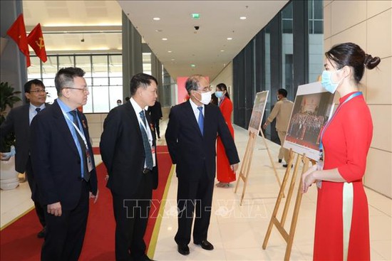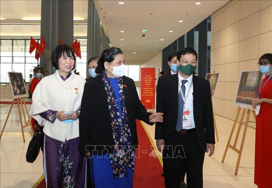 Lãnh đạo Thông tấn xã Việt Nam giới thiệu với Phó Chủ tịch Thường trực Quốc hội Tòng Thị Phóng những hình ảnh của TTXVN trưng bày tại Đại hội. Ảnh: Văn Điệp/TTXVN