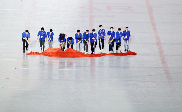 Chiều nay Hà Nội có mưa diện rộng, do đó các tình nguyện viên đã phải nỗ lực để làm sạch sân khấu, sẵn sàng cho màn trình diễn trong Lễ khai mạc SEA Games 31.