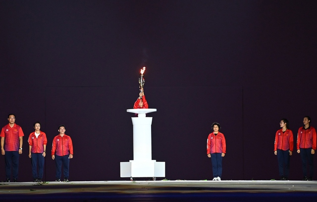 VĐV Quách Thị Lan, Nhà vô địch Asian Games 2018, thực hiện nghi thức thắp sắng đài đuốc SEA Games 31 - Ảnh: Tiền phong