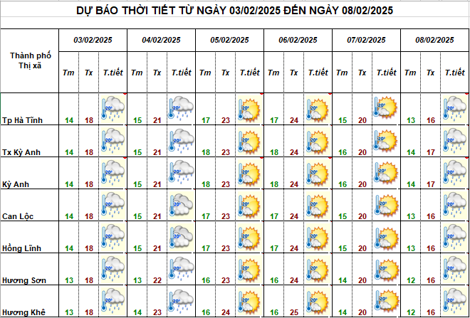 Dự báo thời tiết từ ngày 03/2 - 08/2 Ngày 03 và 04/2, trời nhiều mây, có mưa, mưa rào rải rác, riêng ngày 03, có nơi đạt lượng mưa vừa. Gió đông bắc cấp 3, cấp 4; v
