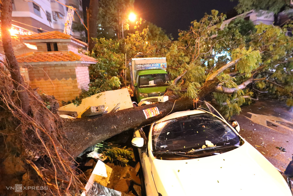 Xe bị cây đè trong mưa giông vào tháng 6 tại Hà Nội. Ảnh: Phạm Chiểu - Võ Hải