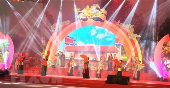 Biểu diễn nghệ thuật tại Lễ kỷ niệm. (Ảnh: Đinh Thuận/TTXVN)Tối 11/12, tại không gian Khu di tích quốc gia đặc biệt Đền Phù Đổng, Huyện ủy, Ủy ban Nhân dân huyện Gia