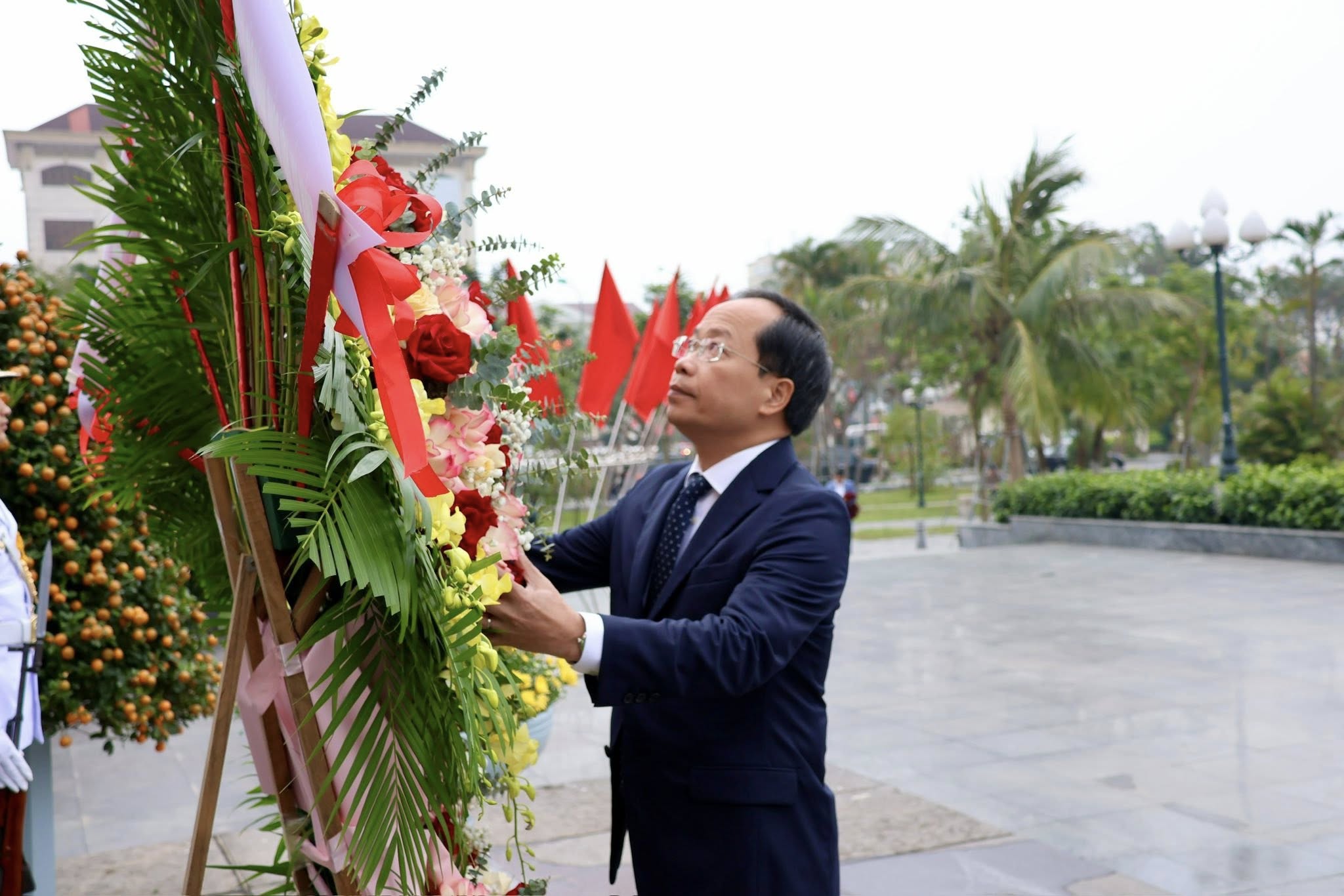 Bí thư Tỉnh ủy Nguyễn Duy Lâm đặt vòng hoa trước tượng đài Chủ tịch Hồ Chí Minh.