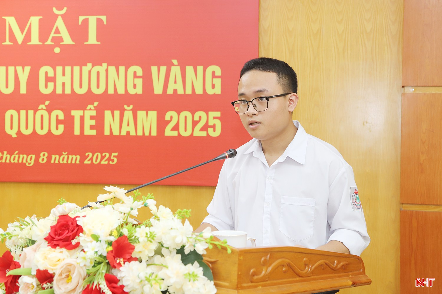 Phát biểu tại buổi gặp mặt, em Trần Minh Hoàng gửi lời cảm ơn sâu sắc về sự quan tâm của tỉnh, ngành GD&ĐT, nhà trường, các thầy cô giáo, bạn bè và những người thân trong gia đình. Sự quan tâm về tinh thần, vật chất thời gian qua đã tiếp sức cho em vượt qua khó khăn để đạt kết quả đáng tự hào. Em sẽ tiếp tục nỗ lực để đạt nhiều thành tích cao hơn nữa, góp phần làm rạng danh truyền thống của nhà trường, của quê hương Hà Tĩnh.