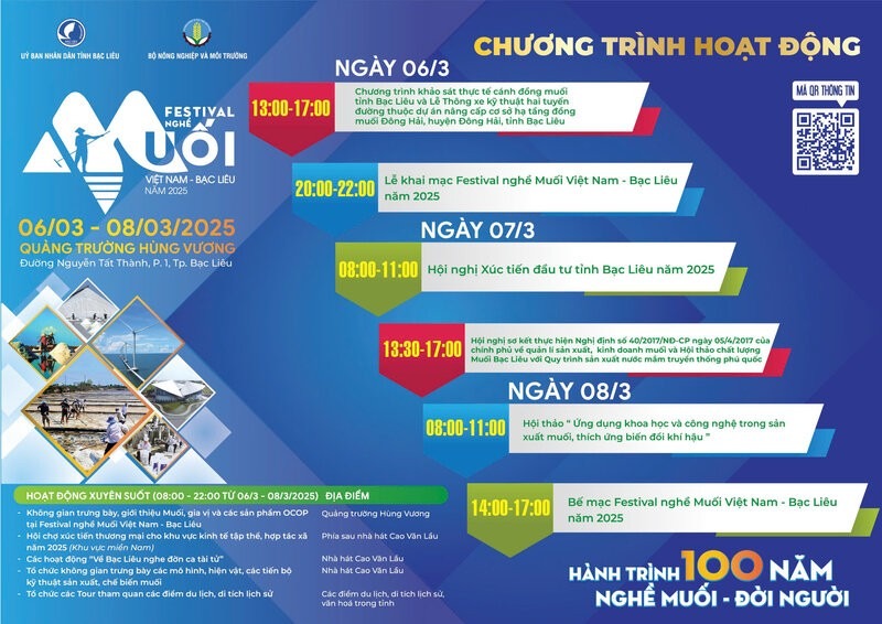 Festival nghề muối Việt Nam - Bạc Liêu năm 2025 có các hoạt động nổi bật như lễ khai mạc, bế mạc; không gian trưng bày, giới thiệu muối, gia vị và các sản phẩm OCOP; hội nghị xúc tiến đầu tư tỉnh Bạc Liêu năm 2025; không gian trưng bày các mô hình, hiện vật, các tiến bộ kỹ thuật sản xuất, chế biến muối; hội thảo “Ứng dụng khoa học và công nghệ trong sản xuất muối, thích ứng với biến đổi khí hậu”…