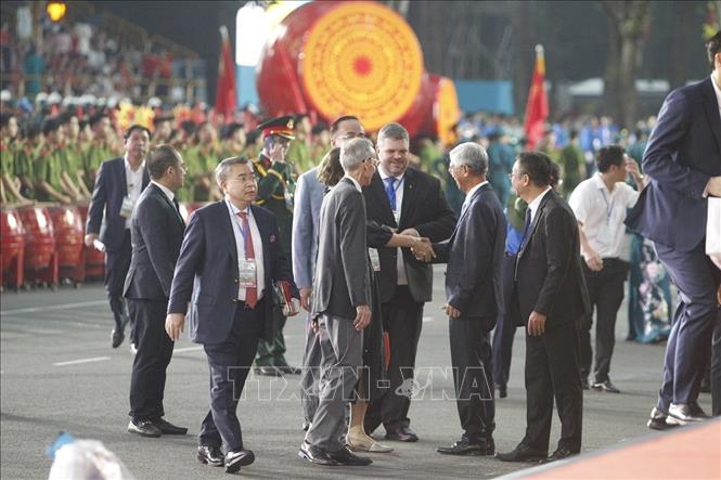 Các đại biểu khách mời quốc tế tham dự buổi lễ lần lượt đến khu vực khán đài trên đường Lê Duẩn, Quận 1. Ảnh: TTXVN